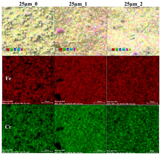 The elemental distributions (made with an EDS detector on 25 µm—0 (1, 2)) of the main elements (Figure 4) determined using the experimental surfaces were in accordance with the chemical composition determinations presented in Table 1. All of the surfaces were covered with oxides and a reduced number of carbon-based compounds.