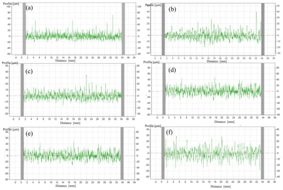 Profilometry of the surfaces of the samples: (a) 25 µm—0, (b) 25 µm—1, (c) 25 µm—2, (d) 50 µm—0, (e) 50 µm—1, and (f) 50 µm—2.
