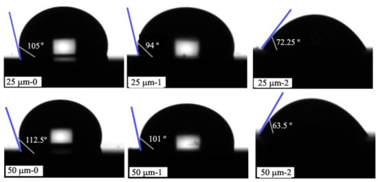 Wettability is important because it accompanies all of the processes that take place at the gas–liquid–solid interfaces for all types of elements used in the medical field. If a metallic material is combined with a liquid, there is a tendency to form a protective liquid boundary layer that physically adheres to the surface of the metal. The protection also refers to the decrease in the corrosion intensity in the area of the boundary layer, which leads to a longer operation and to the preservation of the working dimensions of the functional parameters for a longer time. As the surface roughness increases (in the case of samples without mechanical surface processing), the solution droplets come into contact only with the surface peaks (its roughness), thereby decreasing the solid–liquid contact surface [24]. This phenomenon leads to the formation of an additional liquid–environment interface to complete the total liquid–metal interface, i.e., a decrease in the contact surface and implicitly of the metal corrosion [25]. The following average values of the contact angle for the samples were obtained from the determinations: 25 µm—0: 105° (±0.75°), 25 µm—1: 94° (±0.90°), and 25 µm—2: 72.25° (±1.05°); 50 µm—0: 112.5° (±0.70°), 50 µm—1: 101° (±0.90°), and 50 µm—2: 63.5° (±1.1°).