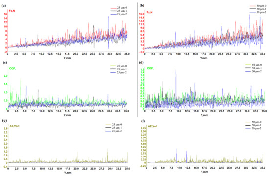 Scratch test results lateral force (Fx) (f) distance: (a) 25 µm and (b) 50 µm; coefficient of friction (COF) (f) distance: (c) 25 µm and (d) 50 µm; acoustic emission (AE) (f) distance: (e) 25 µm and (f) 50 µm.