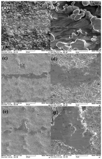 SEM images of the scratch surface of the (a) and (b) 50 µm—0, (c) and (d) 50 µm—1, and (e) and (f) 50 µm—2 for different amplification powers 500× and 1000×.