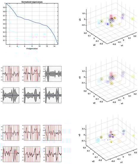 A previously proposed alternative can be established by using the non-parametric Parzen estimators for probability density functions [21,22]. For our particular case, we can consider that a subset of three eigenvectors corresponding to three categories (denoted compactly as , being the jth column of ) is a set of independent and identically distributed observations, so that their empirical statistical distribution is