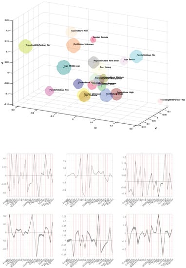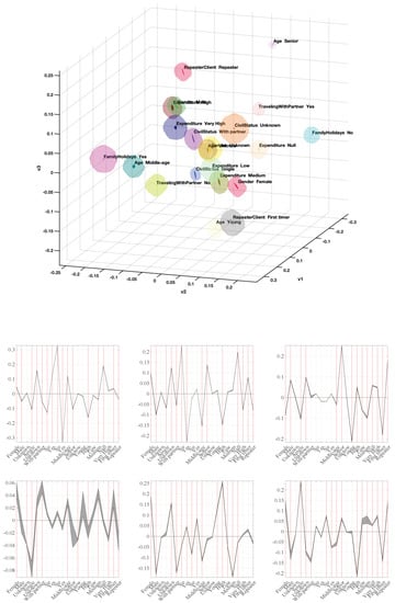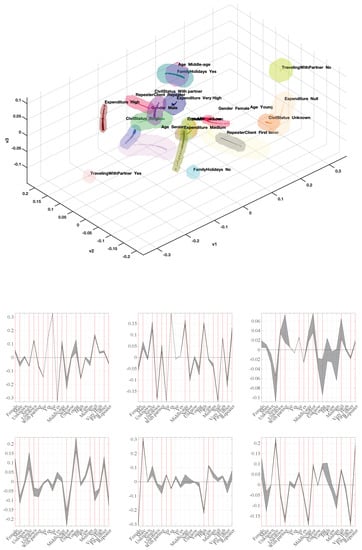 The eigenvector profiles can be used as factors to analyze the groups and relationships in our categorical data. However, their interactions are not always easy to interpret, as in this case. An alternative and visual tool, which holds the statistical support of MCA principles, is commonly used by projecting each separate category to a coordinate system given by the first eigenvectors. Whereas these feature projections are usually addressed in pairs of eigenvectors, we decided here to present the projection onto the three first eigenvectors, as far as they are the most relevant ones in all cases. This allows us to extract client profiles in terms of their closeness in the projected space, and said closeness has the sense of probability of joint occurrence. We roughly distinguish among related (close projected features in the representation) and strongly related (confidence volumes overlapping in the representation). Although the projections onto Eigenvectors 4–6 are often discarded in MCA, they could be also used to extract further relationships and client profiles. Finally, we can distinguish between interpretation in terms of client profiles, given by groups of features which are close among them in the map, and repeater client profiles, which can be scrutinized by focusing on the projection of repeater categories and their closer features.