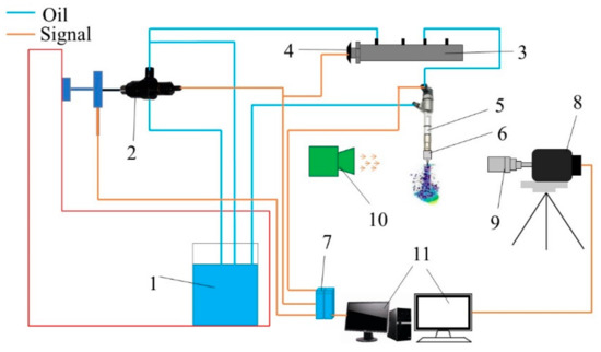 The experimental visualization platform. 1. Oil tank; 2. High-pressure oil pump; 3. High-pressure common-rail pipe; 4. Pressure sensor; 5. Fuel injector; 6. Experimental nozzle; 7. Electronic control unit (ECU); 8. High-speed framing camera; 9. Long focal distance microscope; 10. LED light; 11. Computer.