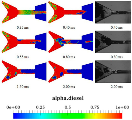 Figure 5 represents the diesel volume fraction (the volume of diesel as a percentage of the fluid volume in the nozzle) in the nozzle at different measurement times at the EOI, and the value is shown in the color bar below. From this figure, it can be clearly observed that the experimental images are very similar to the proposed simulation. Before the needle valve was seated (i.e., 0.2 ms), corresponding to the cavitation occurs only in the orifice. The cavitation occurred in the sac later than in the orifice, and the super-cavitation appeared in the orifice from 0.25 ms.