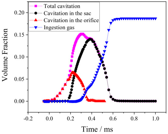 In Figure 7, time-dependent changes in ingestion gas and cavitation in the nozzle are presented. Before 0.25 ms, the volume fraction of cavitation in the nozzle was mainly up to the orifice. After 0.25 ms, the total amount of cavitation in the nozzle depended on the sac, and the cavitation in the orifice began to collapse. However, at the initial stage of the EOI (0.2 ms), there was almost no cavitation in the sac. This indicated that cavitation more likely occurred in the orifice, instead of the sac, which further validated the analysis in Figure 6 and Figure 7. The cavitation in the nozzle was almost zero in the later stage of the EOI, and the maximum volume fraction of cavitation in the sac was close to that of ingestion gas. It is noteworthy that the growth rate of the volume fraction of the ingestion gas is , and the volume fraction reduction rate of cavitation is ; it was concluded that gas ingestion was mainly caused by cavitation collapse.