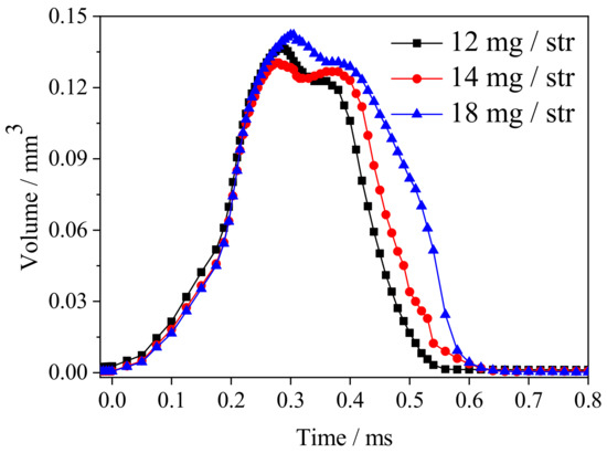 Figure 9 and Figure 10 show the changes in gas volume fraction with time for various fuel mass fluxes (12 mg/str, 14 mg/str, 18 mg/str). As can be seen, the effect of mass flux on cavitation was not obvious at the beginning of the EOI, but it became obvious as the EOI progressed. The sac with a larger fuel mass flow had larger cavitation and lagged at the corresponding time. The reason for this was that because of the larger mass flux fuel with a greater inertia force, the kinetic energy of fuel increased sharply near the sealing surface of the needle valve and inlet of the orifice, resulting in the increased kinetic energy at the nozzle inlet, the rapidly decreased mass flow rate, and the fast velocity of the needle valve, thus making the cross-sectional area of fuel flow near the sealing surface reduce quickly. Therefore, considering the throttle effect and the fuel inertia outflow, a larger velocity and a lower pressure appeared, i.e., the higher fuel mass flux was, the greater cavitation was.