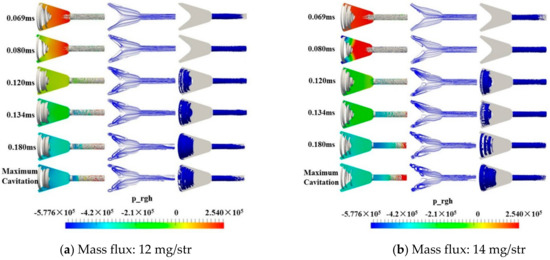 In Figure 9, cavitation in the nozzle reaches its maximum volume at 0.3 ms. The total cavitation had two peaks—the first time at 0.3 ms and the second time at 0.4 ms—which was caused by pressure waves in the nozzle. Analyzing Figure 9 and Figure 10, total cavitation in the nozzle was closed to that in the sac at three different mass fluxes, and the cavitation in the nozzle corresponding to three different mass fluxes was up to the sac after 0.4 ms. After 0.4 ms and until 0.6 ms, the larger the mass flux in the nozzle, the less cavitation reduction there was, which also meant more cavitation. This is because the higher the mass flux near the nozzle inlet was, the more obvious the stretching effect was, and the less viscous dissipation in the wall-attached layer flow was reduced, the more likely it was that the kinetic energy in the nozzle would produce a lower pressure zone. The higher the mass flux, the longer the low-pressure duration was.