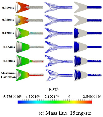 Figure 12 shows the distribution of Q = 2 × 109 iso-surface, streamline, and α = 0.25 vapor iso-surface in the nozzle at different mass fluxes. From left to right are cloud pictures of Q = 2 × 109 iso-surface, streamlines, and α = 0.25 vapor iso-surface, respectively. As can be seen, regardless of whether the mass flux was 12 mg/str, 14 mg/str, or 18 mg/str, the orifice always occurred cavitation first, the cavitation in the nozzle had similar morphology, and the sac was dominated by annular cavitation, while the orifice was bulk. In addition, the annular cavitation in the sac was mainly concentrated at the fuel inlet, then developed from the inlet toward the sac downstream but never reached the bottom of the sac.