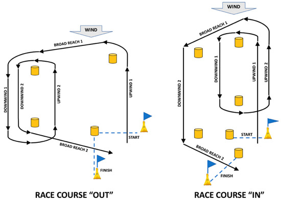 A total of 12 races were analyzed: 6 in the group of males and 6 in females. The wind speed ranges in the regatta were 3.5-8.3 and 4.1-8 knots in the female and male groups, respectively. The race course consisted of 6 legs (2 windward and 4 leeward): 2 upwind, 2 downwind, and 2 broad reach. The regatta race courses depend on the weather conditions and two types of courses were carried out (Figure 1): “In” and “Out”. Both types of routes were carried out by males and females, and the regatta judges determined the realization of one or the other depending on the number of groups of sailors participating in the regatta and in each of the races.