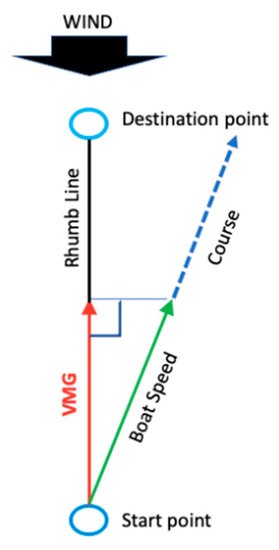 VMG is defined as the speed that the boat reaches directly in windward and leeward courses, and it measures how fast the boat progresses in each of the courses and along the Rhumb line (Figure 2) [26]. This line is the straight line from the start point to the finish line, and it is the shortest distance to complete the course. VMG is a vector that measures a straight line to the next mark; therefore, in addition to speed, it also provides information about the distance between the boat and the destination point [27].