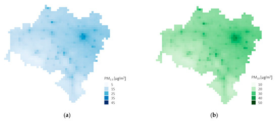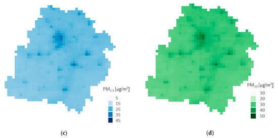 (a) Baseline annual concentration of PM2.5 weighted with population, Lower Silesia, Poland; (b) baseline annual concentration of PM10 weighted with population, Lower Silesia, Poland; (c) baseline annual concentration of PM2.5 weighted with population, Lodzkie province, Poland; and (d) baseline annual concentration of PM10 weighted with population, Lodzkie province, Poland.