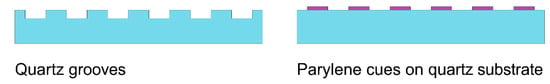 A scheme of quartz grooves in bulk quartz substrate and parylene cues on quartz substrate.