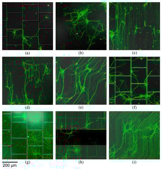 Selective chemical surface treatment is another effective method for neurons’ alignment and patterning. A well-known method is microprinting, where a coating agent is selectively printed on a surface by elevated features from a polydimethylsiloxane (PDMS) stamp [,], and thus, the neurons will adhere only to the coated surface. Among other methods for chemical surface patterning [,], cells can also be patterned by parylene structures on glass substrate [].