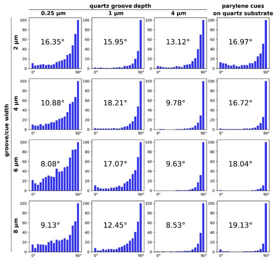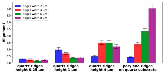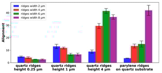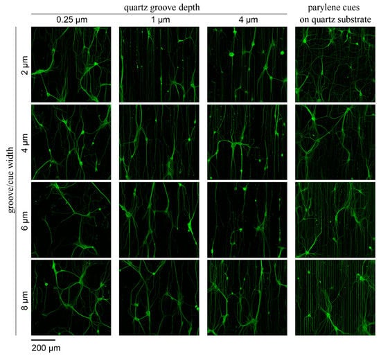 For quartz grooves, the absolute alignment of neurons increased with groove depth. Grooves with depths of 0.25 µm and 1 µm had a higher neuron alignment with a smaller width, while grooves 4 µm in depth exhibited better alignment for widths 4, 6 and 8 µm. This showed that for high neuron alignment, it was better to have a high number of grooves on which neurons grew; however, if the grooves were too deep, neurons needed more space to fit so they could follow the wall of the groove. The highest neuron alignment was found for parylene cues, where the neurons’ alignment increased with the width of these grooves. Good alignment on wide parylene cues was not only caused by the high width of the cues, but rather because of the increased distance between the cues, and thus, the lower probability that a neuron would overstep from one parylene cue to another.