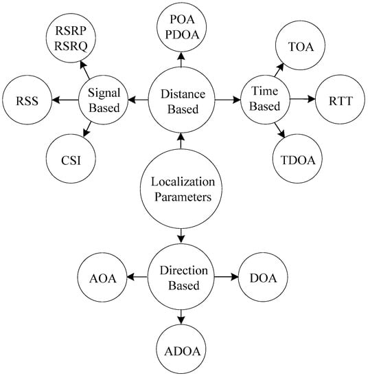 This section presents measurement parameters for localization systems. Several parameters are utilized to determine the target position for indoor localization systems. The fundamental wireless signal measuring theorems in indoor positioning systems are RSSI, TOA, and AOA or DOA. In addition, TDOA, RTT, angle difference of arrival (ADOA), phase difference of arrival (PDOA), POA, CSI, RSRP, and RSRQ are also used in indoor positioning and tracking environments. This section will survey some signal measurements.