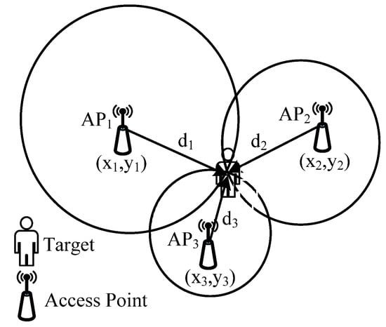 The received signal strength indicator (RSSI) is a comparative measurement of the RSS which has random units and is commonly described by a single chip vendor []. RSSI is a commonly used metric to find an estimation of the distance between a target and the node without resorting to complicated calculations. It computes distance by power loss, the signal strength deficiency, between two nodes. Figure 2 shows the RSSI-based trilateration method. This method can work using only a couple of nodes to obtain a distance estimation []. The RSSI-based algorithm only requires the received signal strength and does not require an auxiliary hardware apparatus and time synchronization, able to achieve higher accuracy than other methods.