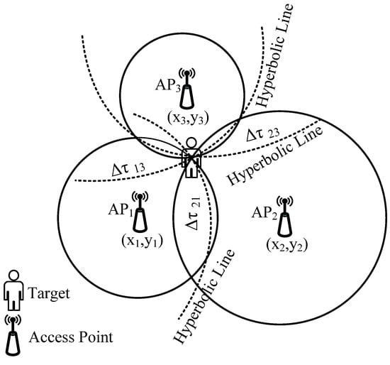 It is a technique to calculate the distance information between the two nodes. TDOA determines the variance of arriving times (timestamps) between the anchor nodes in the same package from the target. Figure 4 illustrates its basic operation for the TDOA-based method. This method requires at least three anchor nodes with known coordinates to find the object position. The anchor nodes listen to transmissions from the target and compute a position estimated by comparing the variances in the arrival times []. This method performs by determining the change in the time between a couple of anchor nodes.