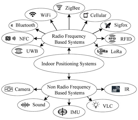 This section describes radio and non-radio-based systems for IPS, depicted in Figure 7. A GPS that receives signals from satellites is broadly used and very popular in outdoor localization applications, but it is ineffective for indoor localization due to the LoS transmission problem. Therefore, various wireless technologies such as infrared, optical (LED, laser), ultrasound, an IMU, vision, VLC, and the radio signals—including Wi-Fi, ZigBee, RFID, Bluetooth low energy (BLE), UWB, long-range radio (LoRa), sigfox, near field communication (NFC) and cellular networks—have been used in IPS. In addition, some of the works have been utilized in hybrid approaches for indoor positioning and tracking. This paper will discuss only the radio signal technologies. Table 2 provides the strengths and weaknesses of the radio technologies for indoor positioning systems.