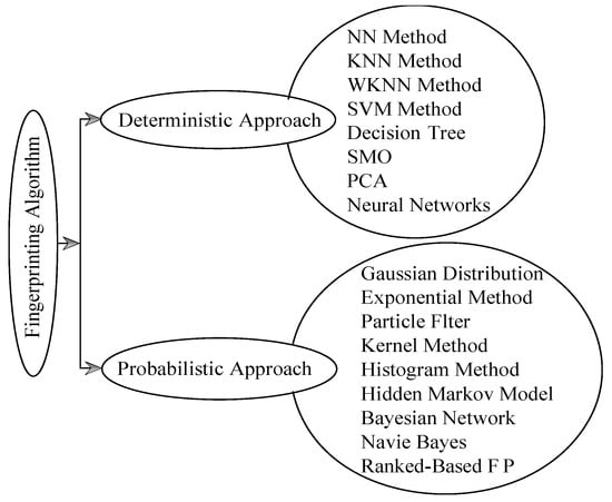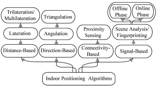 Among these methods, the most popular were presented. As the present review is related to the positioning algorithms or approaches that detect the optimal positioning accuracy of a target within indoor environments, the localization technologies in Section 2 and parameter-based measurement methods in Section 3 were combined with these algorithms at that point for finding the position and the direction of a target object.
