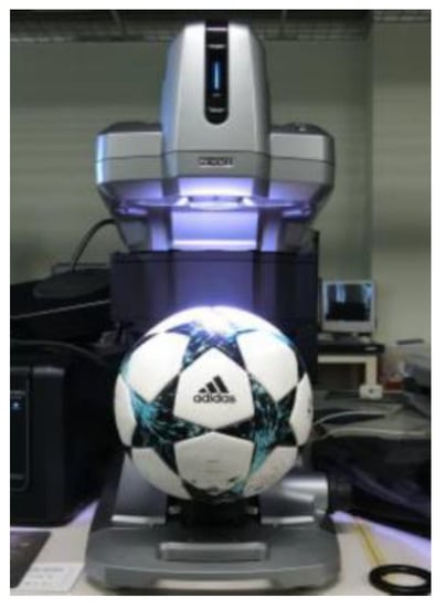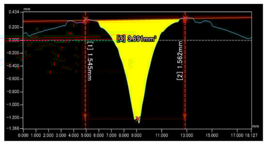 To characterize the balls by the shape of the groove, the length, cross-sectional area, and total volume of the grooves at the panel joint of each ball were measured. The groove length was measured by placing a string over all the grooves. Some soccer balls have more than one type of panel binding groove. Each type of groove was measured three times, and its average value was determined. 3.6% of the maximum variation for each ball in the three measurements. The cross-sectional area and dimensions of the grooves were measured using a KEYENCE VR-3000 one-shot 3D-shape instrument, as shown in Figure 1. The cross-sectional area and depth of the grooves were calculated using the application, as shown in Figure 2. The depth and cross-sectional area were determined with an accuracy of 1.00 × 10−3 m and 1.00 × 10−6 m2, respectively. The total groove volume was calculated by multiplying the groove length by the cross-sectional area for each groove type. The total groove volume was defined by the following equation: