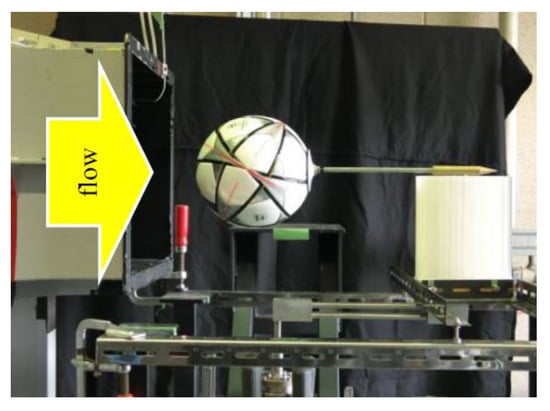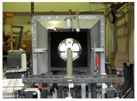 Fluid force measurements were performed on eleven types of different soccer balls with a wind tunnel. The wind tunnel we used is an open type with a sirocco fan. The outlet’s size is 0.38 m × 0.38 m, and the length of the measurement section is 0.78 m. The velocity range was 3~29 m/s with ±1.5% fluctuation, and the turbulence intensity was ±1.0%. The fluid force was measured in the range of wind speed from 3 to 29 m/s every 1 m/s. This speed range covers most of the speed of a soccer ball that is kicked in a real game [16]. For shooting or a free kick, the ball is kicked out at about 30 m/s, and aerodynamic drag decelerates it to about 15 m/s [9]. The ball may also be kicked out at a slower speed when passing. The drag coefficients were measured by placing the ball so that the wind hit the upper panel face of the pictures shown in Table 1. The force acting on the soccer balls was measured by a three component load cell (Fx, Fy, Fz), LMC-3520A by Nissho Electric Works. The measured values were sampled at 1000 Hz for 9.0 s and averaged. The experimental conditions are shown in Figure 3 and Figure 4. The ball was mounted with cobra-type rear support. The drag coefficient, CD, was defined by the following equation: