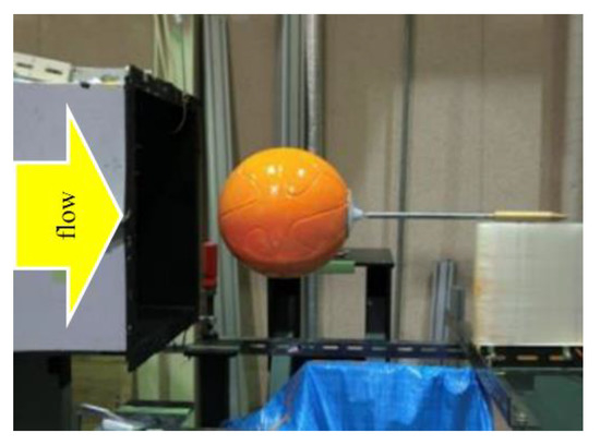In this method, oil film is applied to the ball surface under the wind flow. Since the oil film flows to the point where the flow separates from the ball surface, the separation point can be obtained by measuring oil distribution after measurement. As shown in Figure 5, the oil-film-coated ball was placed in the wind tunnel and measured by flowing the wind under a turbulent wind speed of 29.6 m/s. A mixture of oleic acid, liquid paraffin, and tetra-tri-iron oxide powder was employed for the oil.