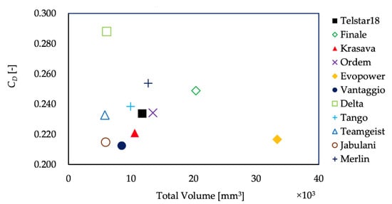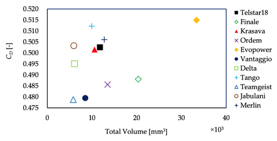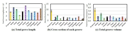 Figure 7a–c show the total length, the cross-sectional area, and the total volume of the panel grooves. For those with multiple types of grooves, such as Ordem, Teamgeist, and Merlin, the length and cross-sectional area were measured separately. Ordem, Merlin, and Finale have relatively longer groove lengths and larger groove volumes. On the other hand, Delta, Teamgeist, and Jabulani have a shorter length and a smaller cross-sectional area of grooves, resulting in a smaller total groove volume. Thus, the length and volume of the grooves vary several times, depending on the ball type.