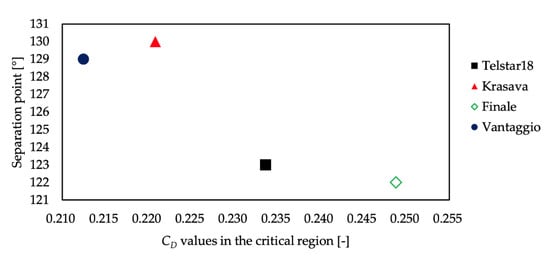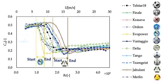 Figure 8 shows the CD diagram for each ball. The drag coefficients of all the balls are large in the laminar flow region where the Reynolds number is low, but in the turbulent area where the Reynolds number is high, a drag crisis occurs, and the drag coefficient becomes small. In the recently released Merlin, the Reynolds number at which the drag crisis occurs is smaller than in other balls. The drag coefficients in the laminar and turbulent regions were relatively more extensive than those of the other balls. As shown in Figure 8, Merlin was characterized by a more considerable panel groove length and volume than the other balls. This larger total volume of the grooves has affected the drag crisis and drag coefficient. The changes in the drag coefficient of the other balls were consistent with the trends shown in previous studies [8,9,12,21,22,23]. Thus, the drag coefficient dropped rapidly from about 0.5 to 0.2 in the Reynolds numbers range from 1.0 × 105 to 2.4 × 105. This drag crisis corresponds to a change in the aspect of the flow around the ball from laminar to turbulent, but the Reynolds number at which the drag crisis occurs varies significantly from ball to ball. Therefore, we focused on the first and the last Reynolds numbers of the drag crisis to characterize these phenomena. The first and last Reynolds numbers of the drag crisis are smallest at 1.0 × 105 and 1.2 × 105 for Evopower and largest at 1.8 × 105 and 2.4 × 105 for Jabulani. The Reynolds number between the start and endpoints of the drag crisis, the critical region’s width, is about 0.3 for Evopower and about 0.6 for Jabulani, which is also a significant difference between the balls.
