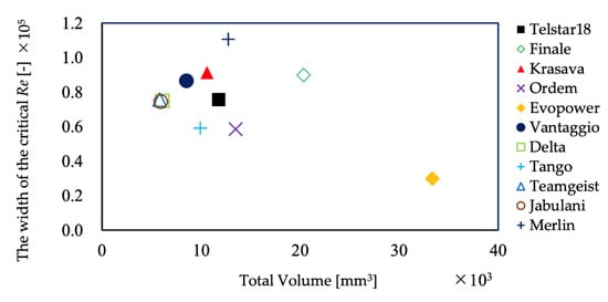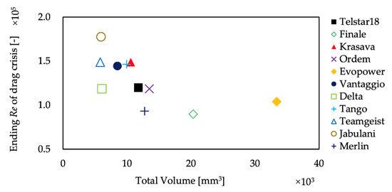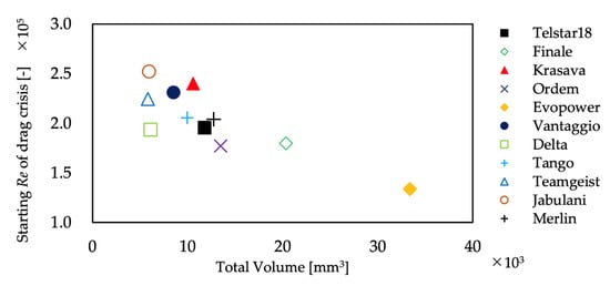 Figure 9 and Figure 10 show the relationship between the volume of the grooves and the Reynolds number to clarify the dependence of the start and end of the drag crisis and the width of the critical region on ball panel geometry. As shown in the figure, there is a strong correlation between the grooves’ volume and the Reynolds number of the critical region. The correlation coefficients are −0.63 for the starting Reynolds number and −0.83 for the ending Reynolds number. Figure 11 shows the relationship between the groove volume and the width of the critical region. Overall, the width of the critical region became smaller as the groove volume was increased. However, when Evopower was excluded, there was no clear correlation between the groove volume and the width of the critical region. Thus, the panel grooves significantly impact how the drag crisis occurs, i.e., the transition from laminar to turbulent flow. In order to elucidate the details of this mechanism, we continued to visualize the separation points by oil film experiments and 2D-PIV measurements to investigate how the transition from laminar to turbulent flow is induced. The relationship between groove volume and the drag coefficient in subcritical and supercritical regions is shown in Figure 12 and Figure 13. There is a weak correlation between the groove volume and drag coefficient of 0.40 and −0.20 in each velocity range, respectively. In the subcritical region, where the flow is laminar, the drag coefficient increases with the number of grooves, i.e., the rougher the surface, the higher the drag coefficient. In the turbulent, supercritical region, the drag coefficient decreased as the volume of the grooves increased. This may be due to the degree of accelerated turbulence, but the trend was not very clear.