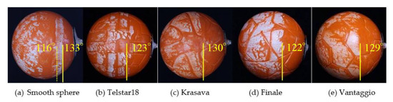 Figure 14 shows side views of oil film measurements for (a) a smooth ball, (b) Telstar 18, (c) Krasava, (d) Finale, and (e) Vantaggio. The wind direction was set from left to right. All measurements were performed at supercritical conditions with Re = 4.3 × 105. In the smooth sphere (a), the first and second separation points appeared on the surface. This feature is consistent with a previous study [4]. The dashed line shows the line of separation bubbles that reattach to the sphere’s surface after the boundary layer has detached. The solid line shows the point at which the flow around the sphere finally separated. As shown in this figure, detachment is delayed in the turbulent flow, indicating that the drag coefficient under the turbulent flow is small. On the other hand, only the turbulent separation line is observed in the soccer ball with panel grooves. This result indicates that the panel grooves have shifted the flow from laminar to turbulent flow. The separation point is nearly the same for all soccer balls, corresponding to the fact that the CD values were almost the same for the drag measurements at a velocity of 29.6 m/s.