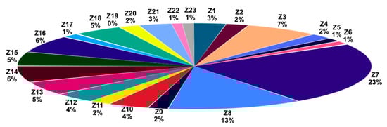 Proof of the accelerated technical wear of building structures is damage to their components. A detailed description of damage to selected elements of downtown tenement houses takes into account their four-group classification at the level of general synthesis—Table 3. It must be remembered however that generically integrated elementary damage is separated therefore their total number is 30—Table 3. There is also a very important assumption made, according to which pinpointed damage is described using number 1 (appears), and its lack using 0 (does not appear). This is due to the fact that the group of experts only identified damage in the analyzed buildings that is independent of their natural wear, i.e., that which occurs to a great extent. They were describing it with clear and decisive qualitative features [56]: “significant”, “very strong”, “strong”, “total”, and similar ones.