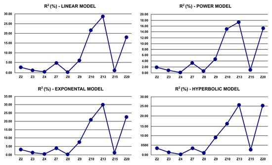 - when assuming that the measure of adjustment of mathematical models to the observed states is the coefficient of determination R2, then only in the case of three elements—the roof structure (Z10), window joinery (Z13) and facade (Z20)—was the value of the wear differentiation of these elements (observed in the test) explained by their partial regression (up to 30%) in relation to the age of the analyzed buildings; this observation was confirmed by the acquisition of the largest amount of current data concerning the age of these elements;