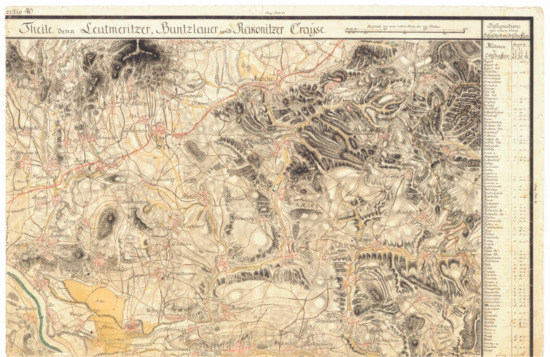The First Military Mapping survey of the Habsburg monarchy was carried out in Bohemia in the years 1764–1767. This incredibly short time was made possible by the fact that the mapping took place from the eye, only by officers on horseback. Enlargements of the Müller map of Bohemia may have been used, which had been made in 1720 at a scale of approximately 1:132,000. The measuring table was probably used in part, the lengths were estimated or stepped. In particular, militarily important objects were mapped: roads, bridges, brick buildings, meadows, pastures, forests, or watercourses. The elevations shown on these maps are made by hachures. In winter, clean drawings of map sheets measuring 61.8 cm by 40.8 cm at a scale of 1:28,800 were created from the original maps created in the field. In addition to the map sheets, textual comments and military-geographical descriptions of the area were supplemented. In addition to 273 map sheets in Bohemia, 19 volumes of topographic descriptions of the landscape were made. Due to the imperfections of the maps, which were manifested in the wars with Prussia in 1778 and 1779, the rectification of the most important (northern) map sheets was ordered. Thus, 141 map sheets were newly mapped and two map sheets were corrected. The differences between the older and rectified maps are not very obvious, for example, the drawing of forest areas differs slightly. Of course, all the resulting maps were confidential. The original map sheets are stored in the Österreichisches Staatsarchiv—Kriegsarchiv. The J. E. Purkyně University in Ústí nad Labem was involved in making these maps accessible [27]. We have a total of 273 raster images of maps of the first military mapping in a resolution of 400 dpi and a color depth of 24 bits (TIFF files without compression). The data volume of each sheet is more than 300 MB. The quality of this digital data is sufficient for most of the intended analyzes. A resolution of 600 dpi would be more appropriate for automatic image pattern searching, automatic text recognition, and other graphical operations.