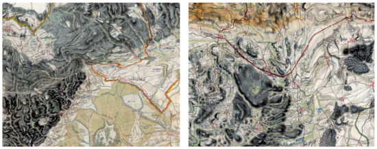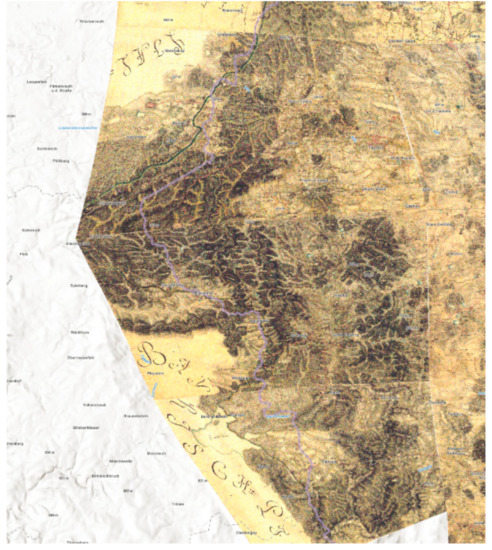 In the second half of the 18th century (1763–1787), the so-called First Military Mapping was carried out on the territory of the former Habsburg monarchy. It arose on the basis of the needs of the Austrian army after the Seven Years’ War (1756–1763) [2]. Unfortunately, these maps were created without geodetic networks, using the à la vue method, and their accuracy is not sufficient from today’s point of view [3]. Individual map sections, brouillons, have rectangular shapes and dimensions of 61.8 cm by 40.8 cm. From this, we can deduce the use of a cylindrical type of projection. In some provinces (Bohemia, Moravia, Silesia, Hungary), it was possible to use existing Müller maps [7] as a basis, probably also made in a cylindrical projection [8]. Molnár and Timár use Cassini’s projection as a probable projection of the map [9]. As each map sheet has been processed separately, the map drawing does not fit exactly on the adjacent edges. Despite this, for a number of historical or environmental studies, there is need to work with mosaics of larger territories, preferably directly-mapped provinces.