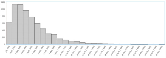 It is obvious that the use of IRLS leads to the reduction of the resulting RMSE, in the case of the polynomial transformation even quite significantly. The resulting error of 280 m is at a very good level according to the parameters of the map creation. The results differ from those published in [28], mainly due to different contamination settings of the input measurements. Furthermore, a different number of map sheets were used (two were discarded) and with a different set of GCPs (some were also discarded or modified after the inspection). The distributions of the resulting deviations (corrections) on GCPs are shown in Figure 4. The maximum frequencies reach deviations in the range from 100 m to 300 m.