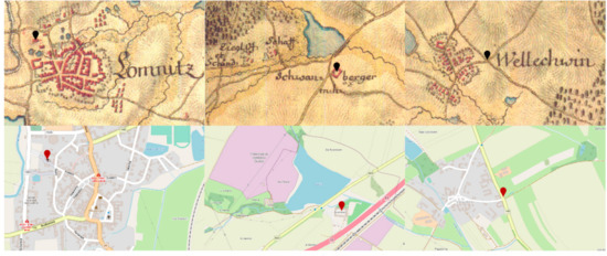 As part of testing the possibility of introducing weights by analyzing the behavior of mean errors of individual adjusted coordinates in test areas in northern Bohemia and their classification into individual defined categories, the existence of a correlation between this categorization and the achieved mean errors was not reliably proven. A higher level of accuracy of the representation of churches and other fixed, important objects (farmsteads, châteaux, yards, mills) has been demonstrated, but assessing the accuracy of road crossings and other “lower” types of GCPs is difficult due to their great diversity and, most likely, a lower priority of the geometric accuracy of their rendition (they could often have been a schematic “background”, mere iconographic symbols, complementing the substantial content of maps). Examples of collected GCPs with their position on the OpenStreetMap can be seen on Figure 6.