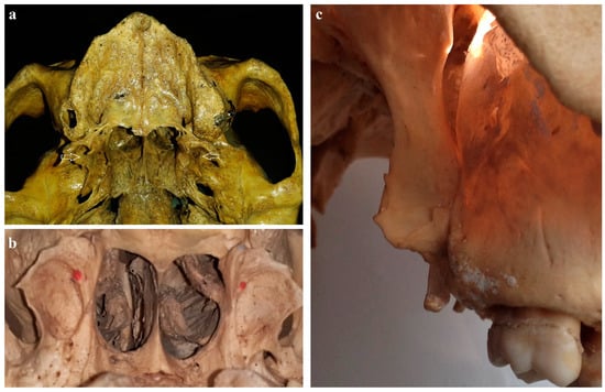 View from distal towards both processus pterygoidei and into the nasal cavity (a,b). White arrows indicate the junction zone of the pterygoid process, maxillary tuberosity and pyramidal process (a). Red points mark ideal penetration points for the apex of the implants (b). This case shows a pronounced atrophy of the distal maxilla (centrifugal atrophy) (b). View of lateral distal maxilla and adjacent processus pterygoidei of the sphenoid bone (c).