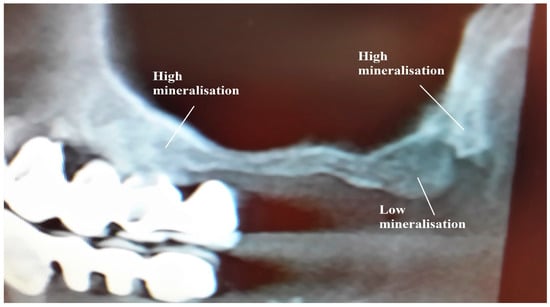 View on distal maxilla and adjacent processus pterygoideus of the sphenoid bone on a panoramic picture. Both the bone of the pterygoid processus pterygoideus and the anterior maxilla show high mineralization, whereas the bone in the region of the two premolars appears strongly atrophied (both from the side of the maxillary sinus and from the crest of the alveolar process) and with low mineralization.