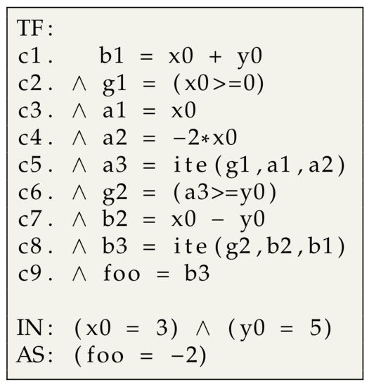 - Lamraoui, S.M.; Nakajima, S. A Formula-Based Approach for Automatic Fault Localization of Imperative Programs. In Proceedings of the 16th International Conference on Formal Engineering Methods, Luxembourg, 3–5 November 2014; pp. 251–266. [Google Scholar] [CrossRef]
