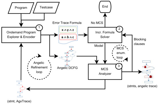 In Reference [12,13,14,15], a static analysis technique was performed to construct a logical formula called program-formula that semantically equal to the input program (with regard to a certain unwinding bound). Specifically, every satisfiable assignment to the program-formula corresponds to a feasible execution in the program, and vice versa every program execution (with regard to a certain bound) corresponds to a satisfiable assignment of the formula. This program-formula is then extended in conjunction with clauses encoding the input values and the assertions of a failing test case to form an unsatisfiable formula. They then feed the extended formula into a pMaxSAT solver, which finds an assignment to the formula’s variables that maximize the number of satisfied clauses. The set of unsatisfied clauses, called a minimal correction subset (MCS) of the formula, indicates a corresponding minimal set of program statements that can be modified to correct the considered error execution. In addition, the obtained variable assignments correspond to a feasible correct execution in the angelically fixed program, which replaces all statements in the MCS with suitable angelic values. As a result, they can provide developers with potential minimal fix location, together with a successful angelic execution, as an explanation.