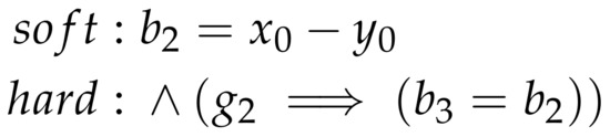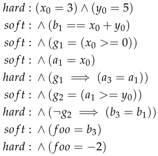 Second, they treat the constructed error trace formula as an instance of a partial MaxSAT problem, in which the clauses encoding the test input and test assertions are marked “hard”, and the clauses encoding program statements in the formula are marked “soft”. They then feed the formula into a pMaxSAT solver to obtain a set of MCSs of the formula. Intuitively, the set of clauses in an MCS indicates a corresponding set of minimal fix locations set, and the maximum satisfiability model of the MCS provides angelic values for these fix locations. Thus, as a result, they can produce a set of minimal fix candidates that can make the given test execution become a success.