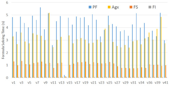 We compared the efficiency of AgxFaults on the real bugs benchmark with only FS and FI techniques. Table 6 shows the comparison results. As shown in the table, the time for solving formulas in AgxFaults is about 1.7 times longer than in FS, and about 95 times longer than FI approaches. As shown in the table, the total running time of AgxFaults is about 1.7 times longer than in FS, and about 5 times longer than FI approaches. The formula solving time accounts for about 43% of the total running time of AgxFault, while that of FS is 41%, and FI is The computation overhead for the formula solving activity account for about 43% of total computation cost of AgxFaults and total running time.