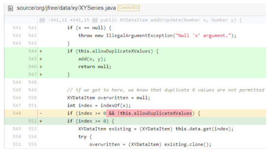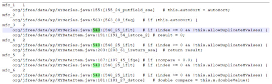 Let us consider bug Chart 5, for example. Figure 11 shows how the developer fixed the bug. To fix the bug, the developer has (1) changed the condition expression of the if statements at line 548 and (2) added additional code at line 544. AgxFaults found 6 MFCs for this bug, shown in Figure 12, and all of these MFCs are feasible (replacing the value of the suspicious expressions with the corresponding angelic value actually results in a successful execution). There are a total of 7 lines of code reported in all MFCs. The actual faulty lines (i.e., the “if statement” at line 548) are reported in 4 MFCs, which are mfc3, mfc4, mfc5, and mfc6. All these MFCs contain the buggy line, together with one additional statement. This result indicates that modifying the buggy if-statement alone is not enough to make the failing test case pass. The developer should modify both the if-statement at line 548, together with one additional statement, as reported in mfc3, mfc4, mfc5, and mfc6. For example, mfc3 shows that modifying the if statement at line 548, together with the assignment “return = 0” at line 203 of the file XYDataItem.java, can make the failing test case a success. The number of lines that the developer has to examine before identify the faulty line is 3, as he needs to examine two lines in the mfc1 and mfc2 before checking the mfc3. The total running time of AgxFaults is about 3 seconds, of which the SMT solver accounts for 0.47 s.