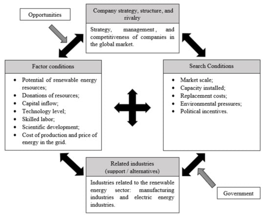 In order to assess competitiveness in the renewable energy industry and to understand the importance of the cluster approach for this sector, an analysis based on the “Porter’s Diamond” model was used. To carry out this research (Figure 1), several articles were used [,,].