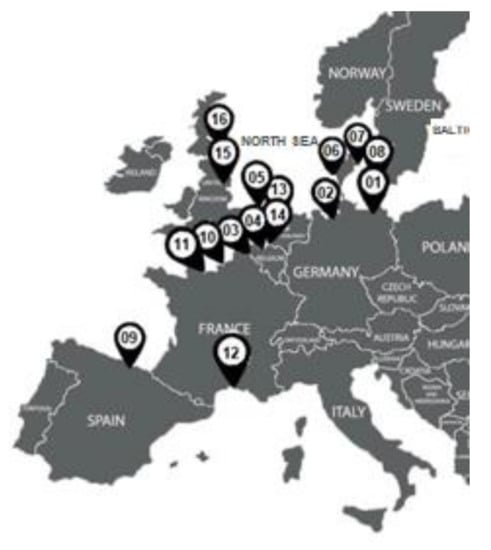 Map with the main seaports related to offshore wind energy in Europe. Legend: 1—Port of Rostock; 2—Port of Cuxhaven; 3—Port of Ostend; 4—Port of Zeebruge; 5—Port of Antwerp; 6—Port of Esbjerg; 7—Port of Grenaa; 8—Port of Rønne; 9—Port of Bilbao; 10—Port of Dieppe; 11—Port of Le Havre; 12—Port of Fos Sur Mer; 13—Port of Amsterdam; 14—Port of Vlissingen; 15—Green Port Hull; 16—Port of Blyth.