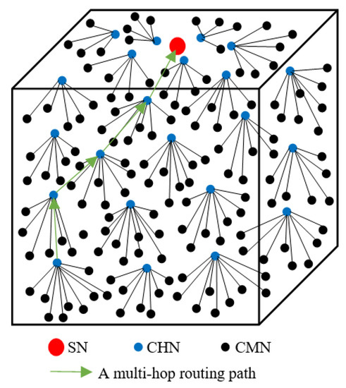 A number of works have shown that clustering routing protocols are effective and efficient in finding optimal routing paths for data transmission, which can save energy and extend the network lifespan [14,15]. The clustering routing protocols divide the whole network into lots of clusters. Every cluster is composed of a cluster head node (CHN) and some cluster member nodes (CMNs). After completion of the cluster formation, the CHN allocates channel resources for the CMNs in the same cluster, and the CMNs send data to the CHN based on the allocation, thereby decreasing collisions [16]. In every cluster, after the CHN receives the data sent by the CMNs, it fuses the received data, which can eliminate the redundant data and reduce the amount of data to be transmitted to the SN, thus contributing to energy conservation [4]. Moreover, the decreased data size reduces collisions during data transmissions. In addition, clustering routing protocols employ a CHN rotation mechanism and select CHNs in every round, which helps avoid the excessive energy dissipation of the selected CHNs, balance the energy consumption, and prolong the network lifecycle [17].