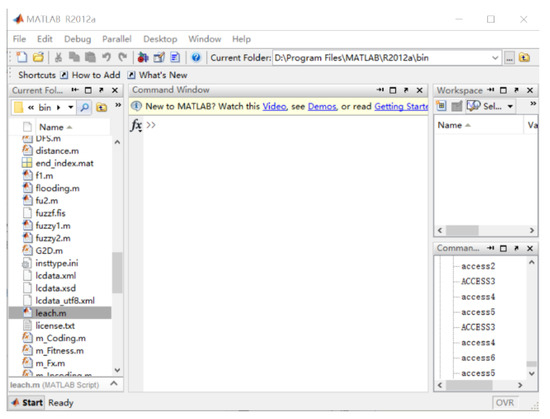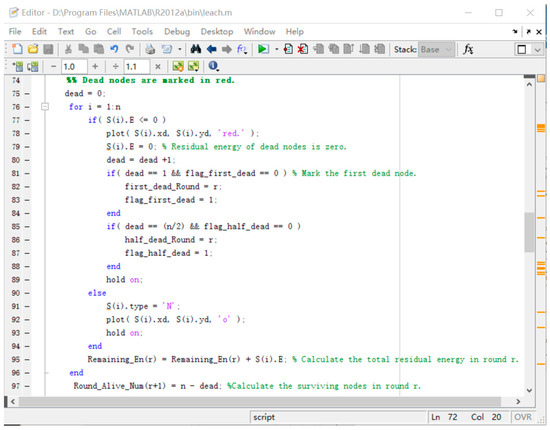 In this section, some existing underwater clustering routing protocols: EGRC [30], LEACH-ERE [28], LEACH [27], FCMMFO [31], and FBCPSO [32] were selected as the references to verify the proposed EECRP. The used metrics for evaluating the performance were the network lifetime, the energy consumption, and the packet loss rate. We used MATLAB to conduct the experiments. MATLAB is a simulation software, which can be applied to sensor networks, data analysis, deep learning, image processing, computer vision, risk management, control systems, communications, signal processing and so on. It is an abbreviation of matrix and laboratory and it is developed by MathWorks. The MATLAB settles the high-tech computing problems such as scientific computing, visualization, and interactive programming. It integrates many powerful functions like numerical analysis, matrix calculation, scientific data visualization, and nonlinear dynamic system modeling and simulation in an easy-to-use software environment. It provides a comprehensive solution for scientific research, engineering design, and many scientific problems that require effective numerical calculations. Moreover, it gets rid of the editing mode of traditional non-interactive programming languages, such as C and Fortran, to a large extent, and it provides many feature-rich practical toolboxes such as signal processing toolboxes and communication toolboxes. Figure 7 displays the MATLAB workspace and Figure 8 illustrates some code of calculating the nodes alive.
