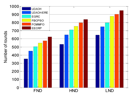 This section compares the six protocols and analyzes the network lifetime of them by the number of surviving nodes in deferent rounds when 300 nodes are considered in the network. As illustrated in Figure 9, regardless of which protocol we use, the number of surviving nodes decreases as the number of rounds increases. Nevertheless, our proposed EECRP outperforms its competitors in the number of nodes alive. For better evaluation of the EECRP, we bring in indicators namely FND (first node dead), HND (half of the nodes dead), and LND (last node dead). As shown in Figure 10, the first node of the LEACH, LEACH-ERE, EGRC, FBCPSO, FCMMFO, and EECRP dies in about the 353rd, 451st, 505th, 548th, 574th, and 623rd round, respectively, which means that in terms of the FND indicator, the efficiency of the EECRP is 8.5%, 13.7%, 23.4%, 38.1%, and 76.5% higher than that of the FCMMFO, FBCPSO, EGRC, LEACH-ERE, and LEACH, respectively. In terms of the HND and the LND, the EECRP outperforms the LEACH protocol by 57.3% and 46.5%, respectively. To conclude, the proposed EECRP is the most effective in extending the network lifetime as it uses the enhanced CHN selecting scheme, which distributes the network load equally. In addition, the EECRP uses the BPNN to fuse data and adopts the GA to identify the optimal multi-hop transmission paths, reducing and balancing the energy consumption. The LEACH performs the worst among these protocols because it does not take the residual energy of nodes into account when selecting CHNs, which makes some selected nodes with low energy die too early. Additionally, the multi-hop transmission paths between the CHNs and the SN have not been considered in the LEACH. The FCMMFO and the FBCPSO outperform the LEACH, LEACH-ERE and EGRC. Nevertheless, they are both inferior to the EECRP, which is because they do not optimize the multi-hop routing paths between the CHNs and the SN.
