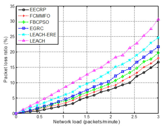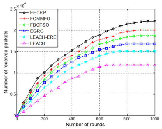 This section analyzes the performance of the network with 300 nodes and compares the six protocols by the packet loss rate, which is defined as the rate of the number of data packets sent by CHNs to the number of data packets received by the SN. The network load is defined as the number of data packets sent by every CHN per minute. Figure 13 illustrates the packet loss rate versus the network load for these six protocols, from which we conclude that the packet loss rate rises as the network load increases for these six protocols. However, the EECRP always has the lowest packet loss ratio. For example, when the network load is 3 packets per minute, the packet loss ratio of the EECRP, FCMMFO, FBCPSO, EGRC, LEACH-ERE, and LEACH is 16.8%, 18.1%, 19.8%, 21.6%, 24.6%, and 30.8%, respectively. The LEACH has approximately a 1.8 times higher packet loss rate than the EECRP does, which is because the EECRP employs the BPNN to fuse the data. Furthermore, it uses the improved GA to find the optimal multi-hop transmission paths, which is capable of reducing the risk of packet loss. Figure 14 displays the number of the packets that the SN receives versus the number of rounds for different protocols. The protocol is more effective when more packets are received by the SN. Apparently, the EECRP protocol is the most effective one, the efficiency of which is 86.7%, 18.1%, 31.3%, 46.9%, and 10.1% higher than that of the LEACH, FBCPSO, EGRC, LEACH-ERE, and FCMMFO, respectively, in round 1000.